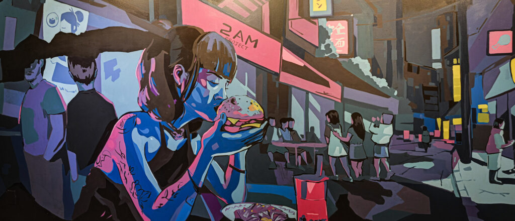 2AM is a late-night restaurant in Baltimore with a big personality. They asked for murals that would grab attention and create a fun atmosphere. Outside, we painted a busy city scene inspired by Tokyo’s famous Shibuya Crossing. Inside, we created a cozy mural that shows people enjoying street food under glowing signs. Together, the two murals give the restaurant a lively and unique look that matches its bold menu and after-hours vibe.
