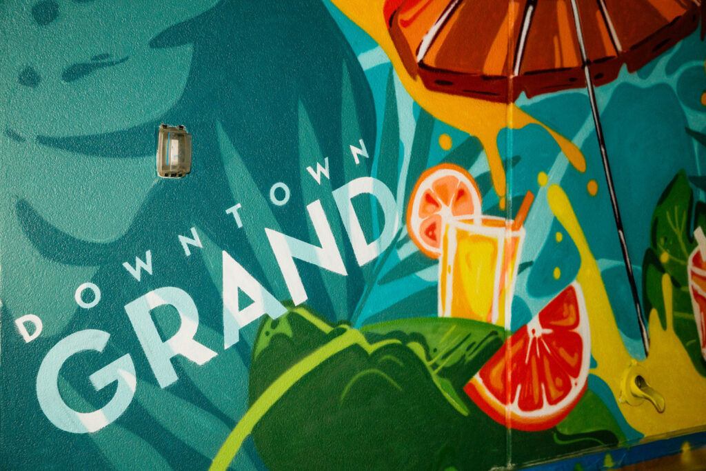 At CITRUS, the rooftop bar at the Downtown Grand, we painted a mural that matches the fun and laid-back feeling of the space. It features a giant umbrella and a huge cocktail glass, perfect for guests to pose with and share on social media. The mural makes the rooftop more than just a place to relax, and it adds a fun, visual moment for every visitor. We even worked during cooler hours to beat the August heat and get the job done safely.