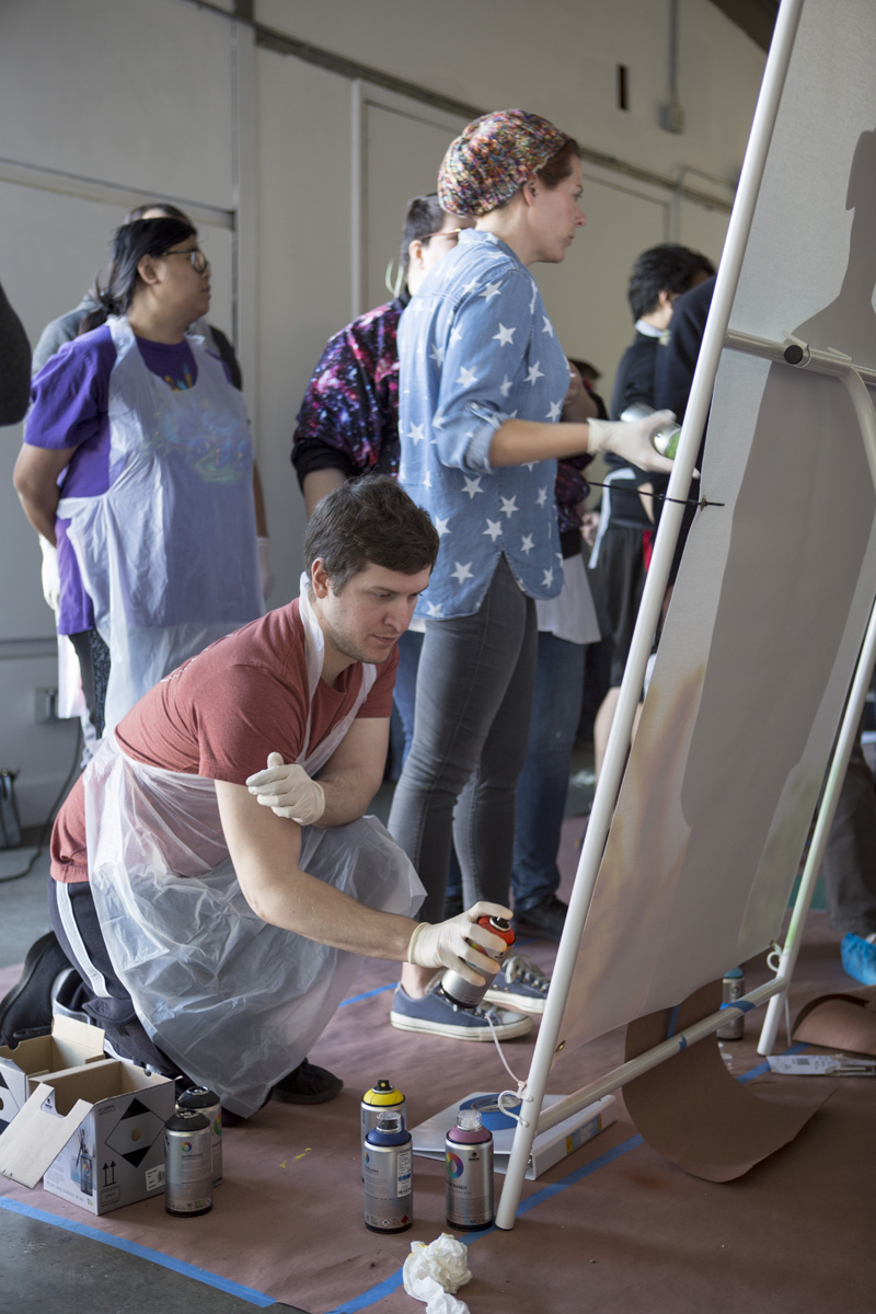 Sometimes, clients that already have a creative team want more freedom to work independently. In Los Angeles, we worked with Riot Games to host a workshop where we set everyone up with all the supplies needed to create their own pieces that they could keep after the event. Our street art workshops provide protective gear for participants including gloves, masks, aprons and shoe covers. Consequently, people can come as they are from the office without needing to dress for the occasion. After we taught the teams how to use water based spray paint, we gave them all the supplies to create their own small murals with stencil supplies and tape. Finally, each team had the chance to present their artwork to the whole group.